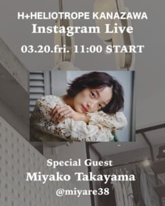 2026.03.19 お知らせ 【高山都】インスタライブ出演情報 【H+HELIOTROPE 金沢店】Instagramライブ配信 ▼配信日時 3.20(Fri) 11:00〜 ▼配信アカウント 高山都公式Instagram(@miyare38) H+HELIOTROPE 金沢店より、 モデル 高山都さん(@miyare38)をお迎えしてインスタライブを配信いたします。 enrica×H+HELIOTROPE別注アイテムをはじめ、高山さんの気になるアイテムや おすすめのスタイリングをご紹介いただきます。 ぜひご覧くださいませ! SHARE 一覧へ戻る